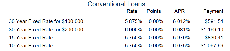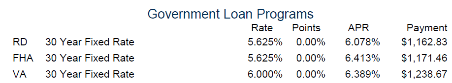 Pricing above reflects a 700 or above credit score and a loan to value of 96.5% on the FHA and 100% on the RD and VA loans. Payment is based on loan amount of $200,000 plus upfront MIP or guaranty fees. Payments do not include escrows or required mortgage insurance. Rates are subject to change without notice.